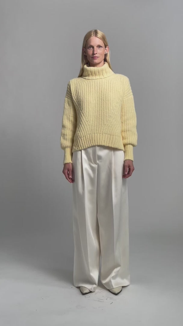 Ali is a relaxed t-neck sweater with feminine-blouson sleeves made with the softest brushed-alpaca-blend yarn. The sumptuous, signature fisherman-stitch body and sleeves contrast the chunky wide-ribbed turtle-neck. Ali is extremely light and lofty! This piece is perfect to style in a relaxed or polished way, for whatever your mood!