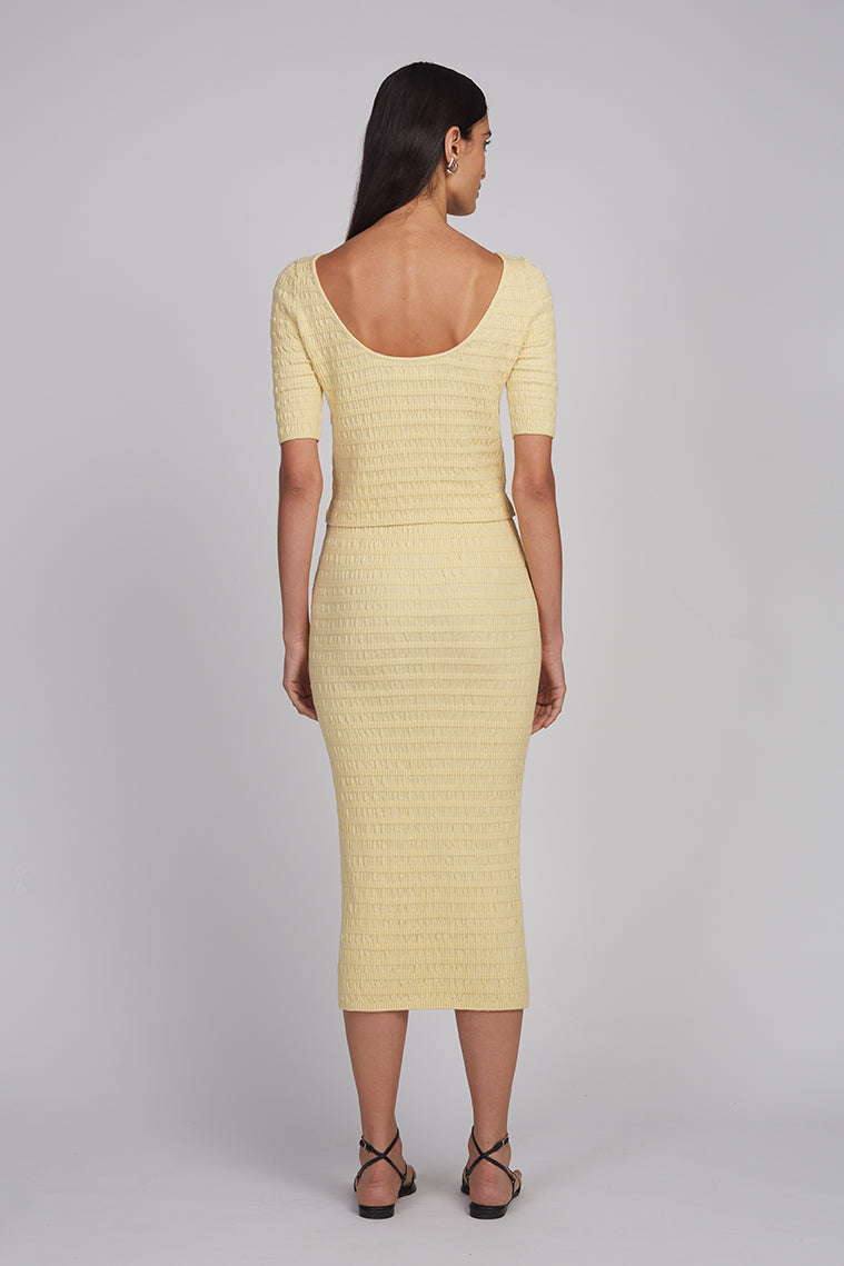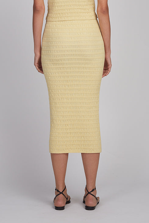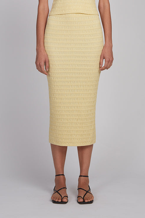 Carrie is a pull-on sweater tube skirt crafted in a softly textured seersucker stitch, rendered in a warm butter tone that feels sunlit and effortless. Designed as an easy wardrobe staple, it features a flattering high-waist silhouette with an elasticated jersey waistband for intuitive comfort and ease of wear. For a head-to-toe sweater-dressing moment, style Carrie with the matching Katia Tank for an understated, luminous look that drifts seamlessly from day into evening.