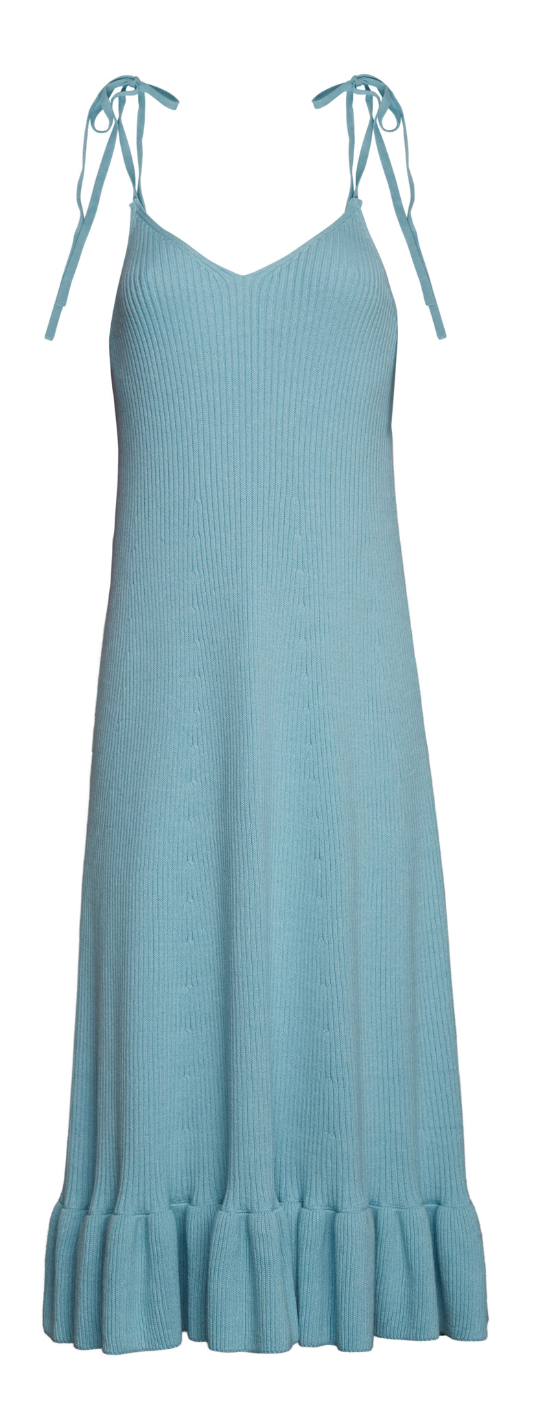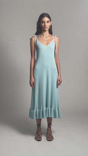 The Cecilia Dress is an elegant, pop-on-and-go silhouette designed for effortless allure. Crafted in fully fashioned cotton fisherman rib, it skims the body before releasing into a softly gathered ruffled hem that moves with graceful fluidity. Effortlessly refined, it embodies relaxed elegance—easily styled up or down to suit the moment. Finished in a coveted Skye Blue hue, it’s a color we’re utterly in love with.