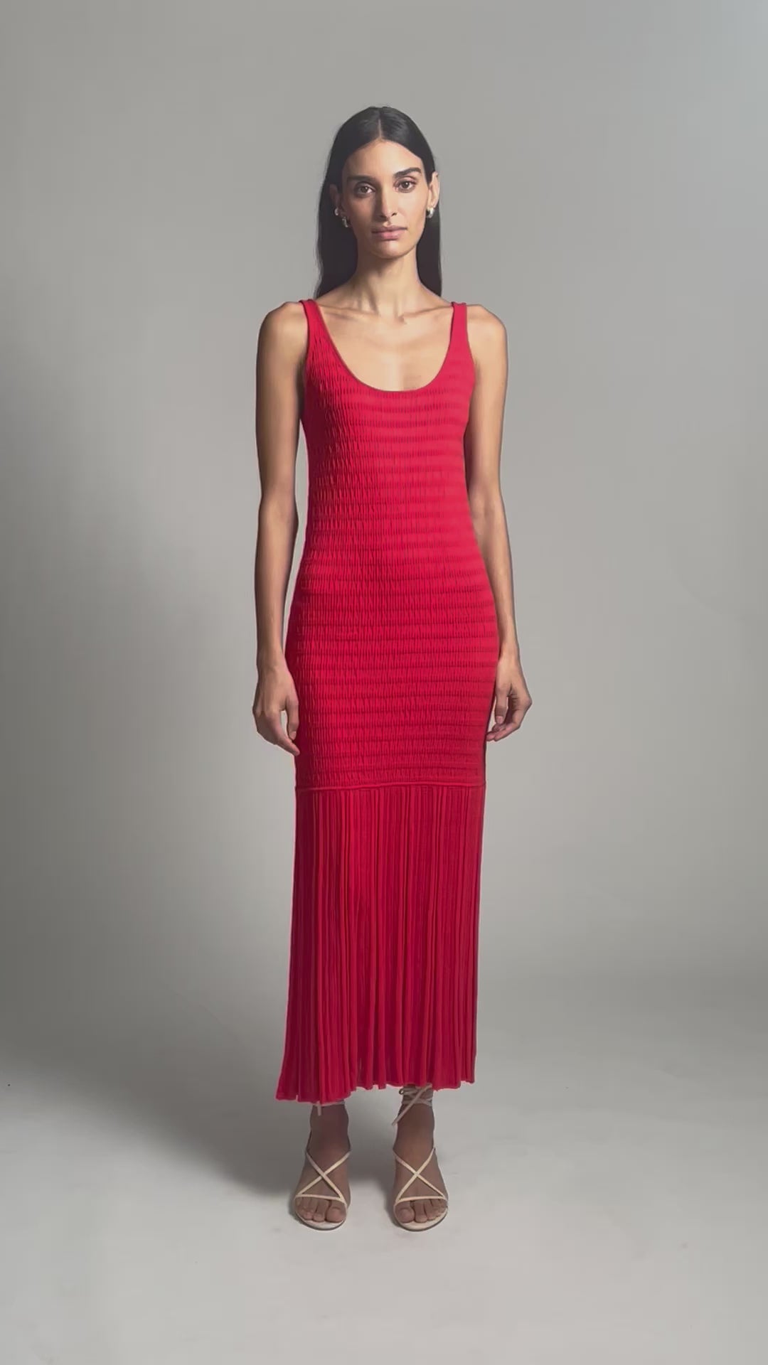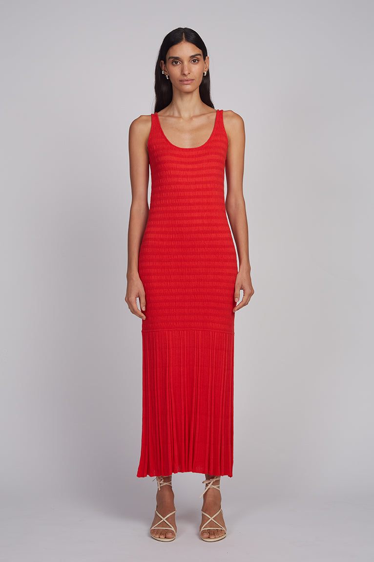 Freya is a slim seersucker-stitch tank dress that transitions into a dropped-waist fluted rib skirt, creating graceful movement and a beautifully balanced silhouette. Designed with flattering scoop necklines at the front and back, it makes a statement in chic, vibrant Rosso Red. Effortless from day to night, Freya rolls neatly into your vacation suitcase or slips on with ease for polished everyday wear.