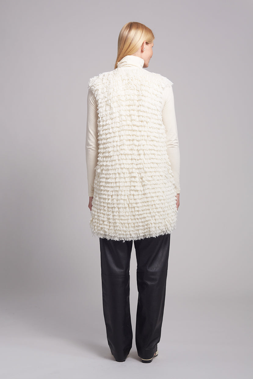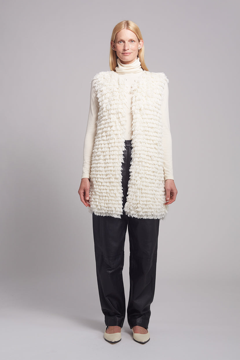 The Ida Vest is a relaxed, yet novelty sweater-vest to layer up. Knit in the softest, alpaca-blend yarns in a layered, fringed stitch in classic ivory this jacket is an emotional, feel-good piece to dress up or down.
