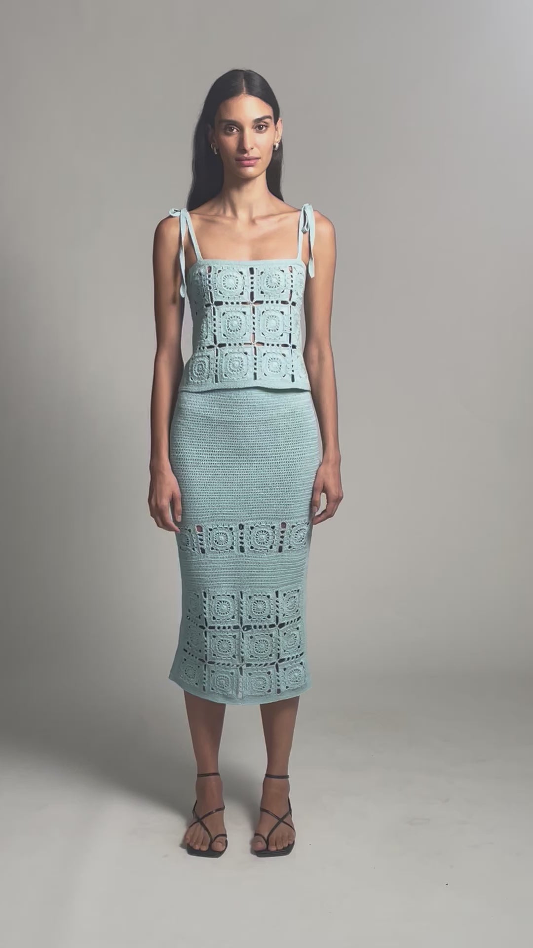 The Iola Crochet Cami Top is hand-crocheted in a bold, textured interpretation of the classic “grandma squares” stitch. Adjustable tie straps at the shoulders allow for a personalized fit, while tassel ties at the back add a considered decorative detail. Style Iola with the matching Jana Crochet Skirt for a cohesive statement, or pair it with your favorite high-waist trousers for an effortlessly refined look.