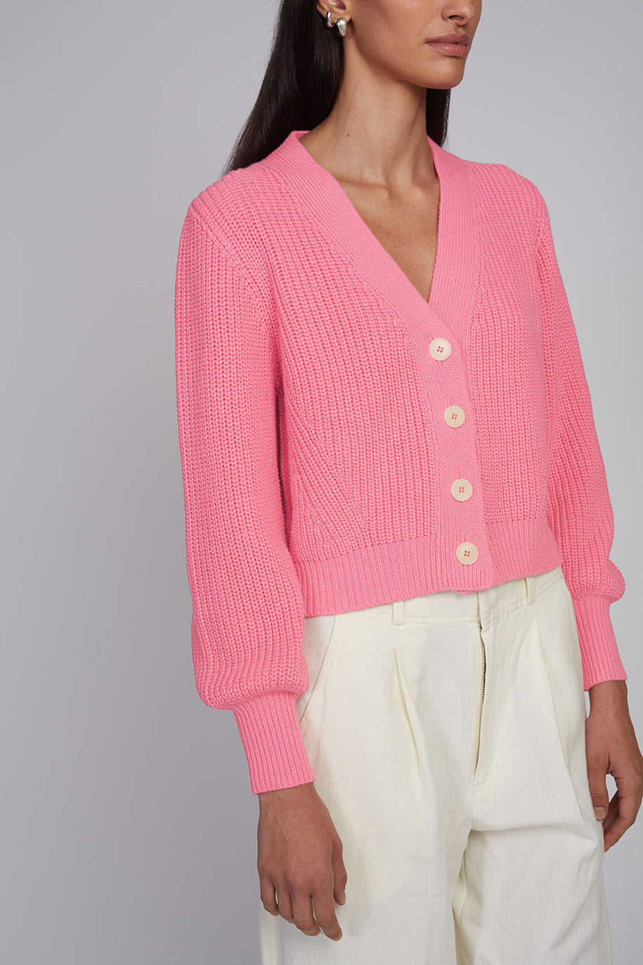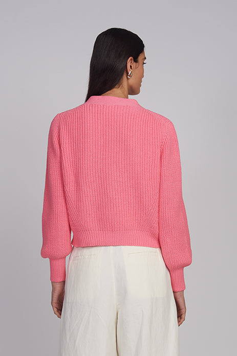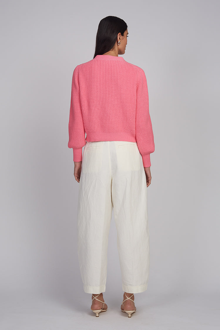 Isla Cardi is a polished cotton reverie, reimagining our beloved Fall staple, the Sara Cardi, through a lighter, more luminous lens. Subtly blouson sleeves and a softly cropped silhouette skim the body with quiet femininity, while a clean four-button closure invites moments of reveal—worn close through the day, loosened as evening unfolds. Knit in classic fisherman rib from sleek mercerized cotton, Isla drapes with gentle structure, effortless yet intimate, relaxed yet refined. A truly transitional piece designed to carry you seamlessly from morning light into dusk.