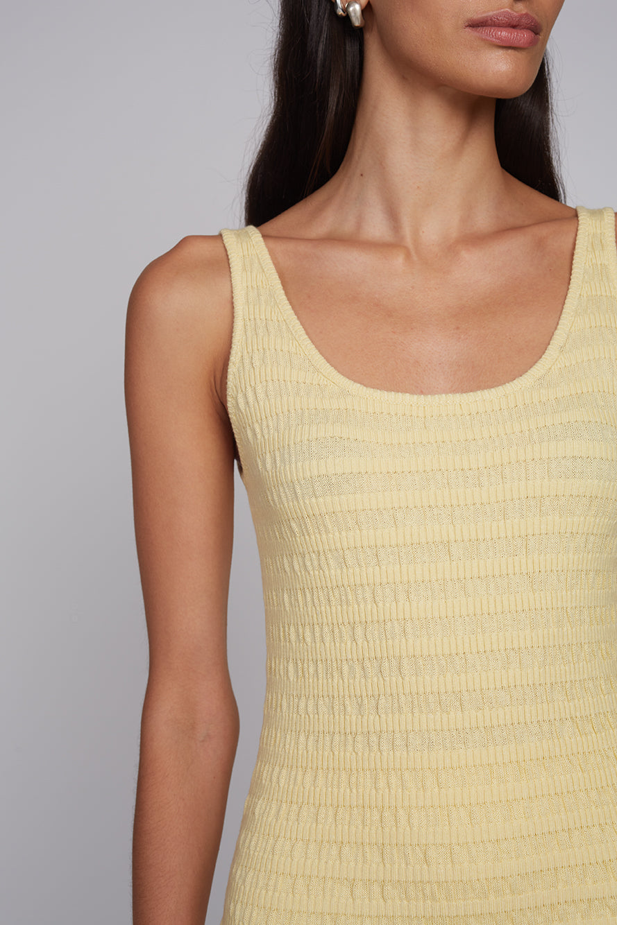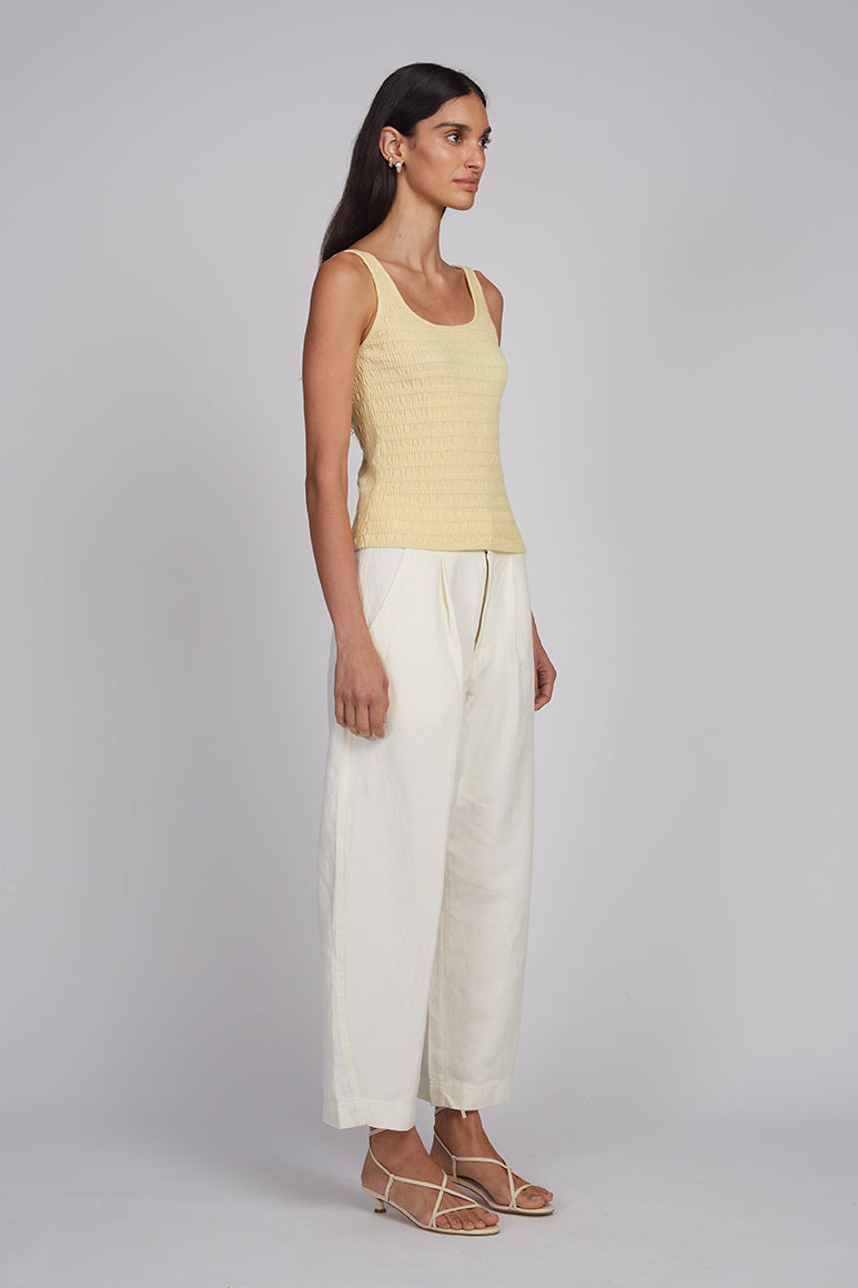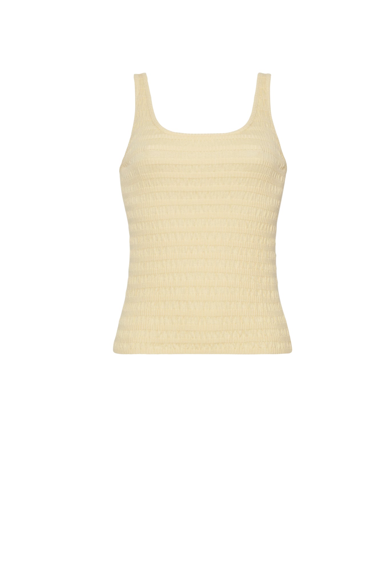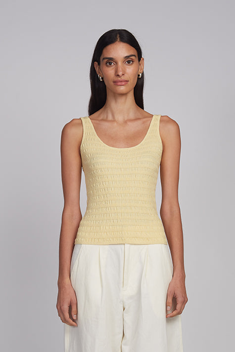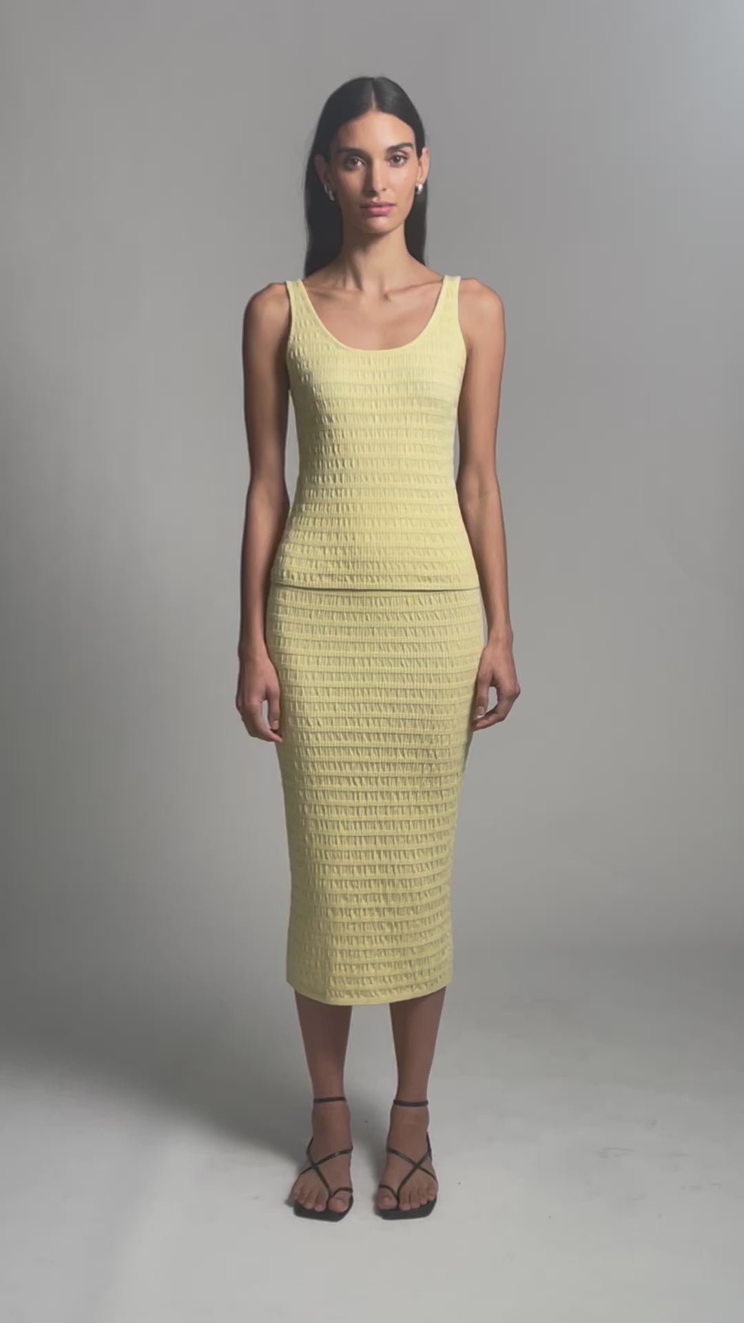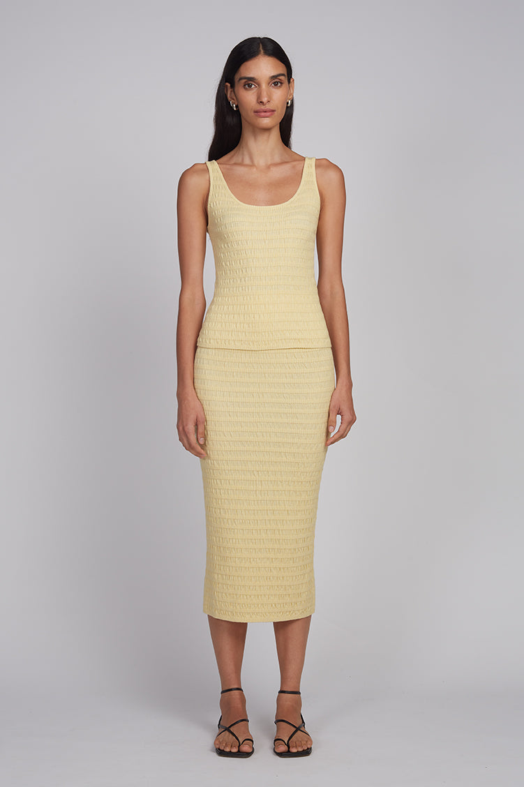 Katia is an effortlessly slim sweater tank designed to flatter with understated elegance. Knit in a feminine seersucker texture stitch and rendered in the softest butter hue, it offers subtle dimension with a refined hand-feel. A flattering scoop neckline at both the front and back creates a balanced, feminine line—perfect for an easy day-to-night sensibility. Style Katia head-to-toe with the matching Carrie Skirt for a polished, coordinated knit look, or tuck it into your favorite high-waisted pant for a more tailored, modern expression.