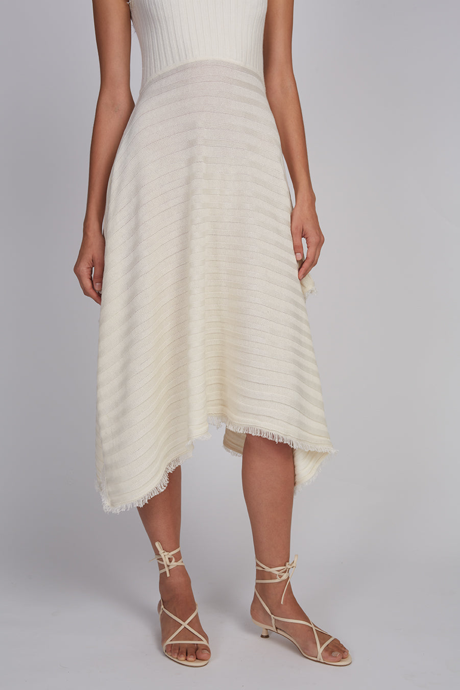 The Khloe Dress is a sleek, slim-fit to the waist tank silhouette with a crew neckline and a deep V-neck keyhole open back. A handkerchief hem, finished with frayed fringe, moves beautifully with every step—dramatic yet refined. Rendered in classic Pearl, the wide flat rib stitch is plaited with elastane for gentle structure and effortless ease. Designed for candlelit evenings and sun-warmed escapes alike, Khloe delivers understated allure with an easy pop-on-and-go sensibility.