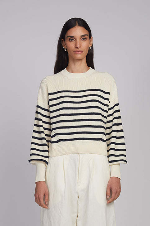 Layla is ELEVEN SIX’s effortless spring sweater, designed to be worn close and lived in. Feminine blouson sleeves fall gently from the shoulder, while the slightly cropped, relaxed silhouette moves with an easy sensuality. Worn with high-waisted pants, Layla feels quietly elegant; paired with the matching Lea Stripe Short, it becomes a playful, sun-warmed stripe moment—easy, intimate, and unmistakably refined.