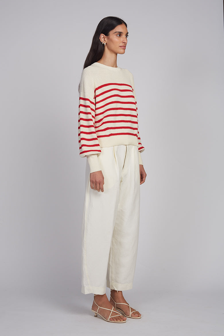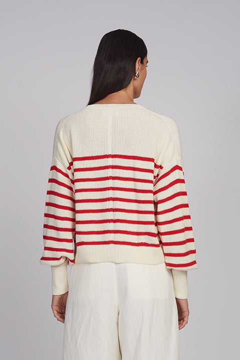 Layla is ELEVEN SIX’s effortless spring sweater, designed to be worn close and lived in. Feminine blouson sleeves fall gently from the shoulder, while the slightly cropped, relaxed silhouette moves with an easy sensuality. Worn with high-waisted pants, Layla feels quietly elegant; paired with the matching Lea Stripe Short, it becomes a playful, sun-warmed stripe moment—easy, intimate, and unmistakably refined.