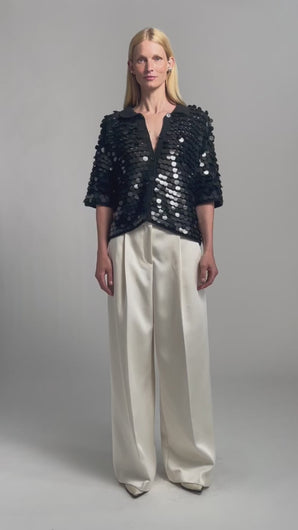Phoebe is an elevated shirt made from sleek, Peruivan Cotton in an open crochet-stitch with large sequins applied all over the body, giving Phoebe an emotional holiday feel. Phoebe has a slightly cropped proportion which styles elegantly back to a jean, dressy pant, or skirt like our Carrie Tube Skirt.