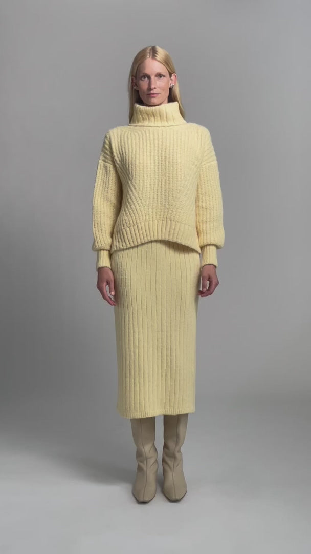 Pia is our versatile, flat-rib sweater tube-skirt, to pull on-and-go as an easy wardrobe stable for a head-to-toe sweater-dressing look. This skirt has a flattering high-waist proportion with an elasticated waistband trim to position where suits.