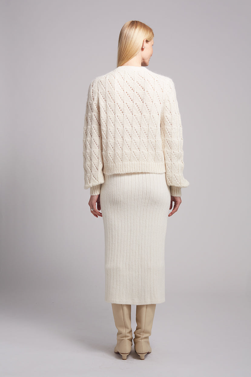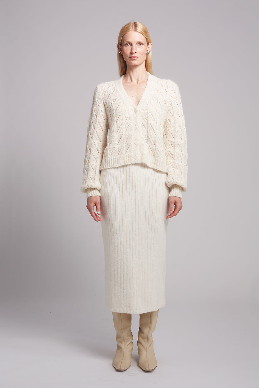 Pia is our versatile, flat-rib sweater tube-skirt, to pull on-and-go as an easy wardrobe stable for a head-to-toe sweater-dressing look. This skirt has a flattering high-waist proportion with an elasticated waistband trim to position where suits.