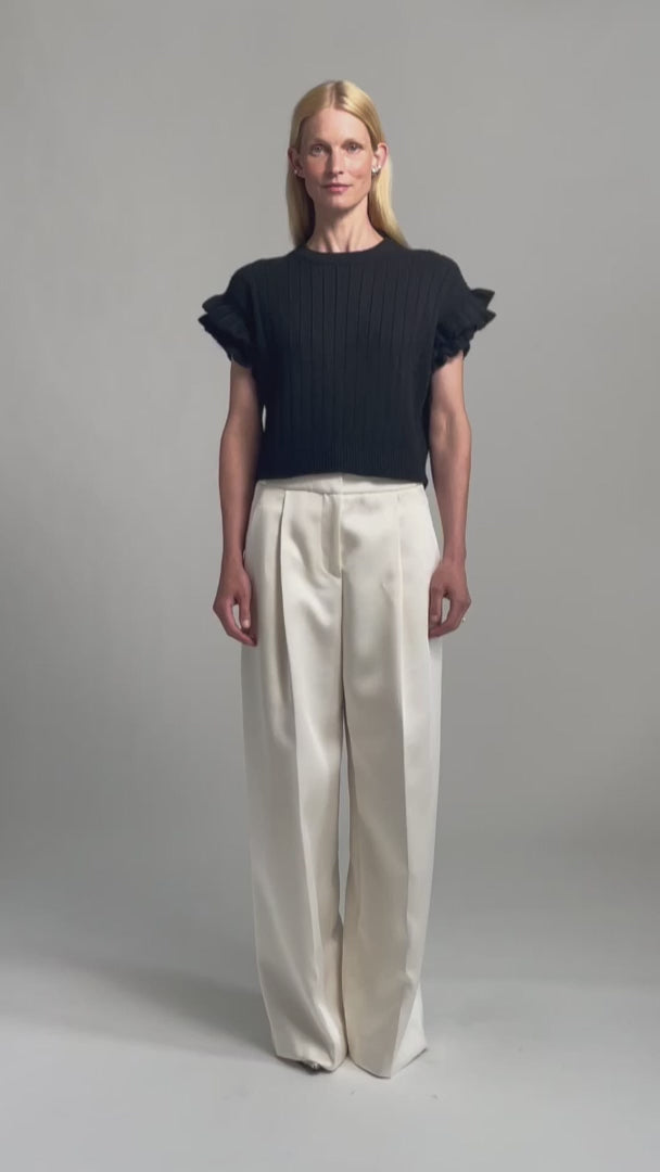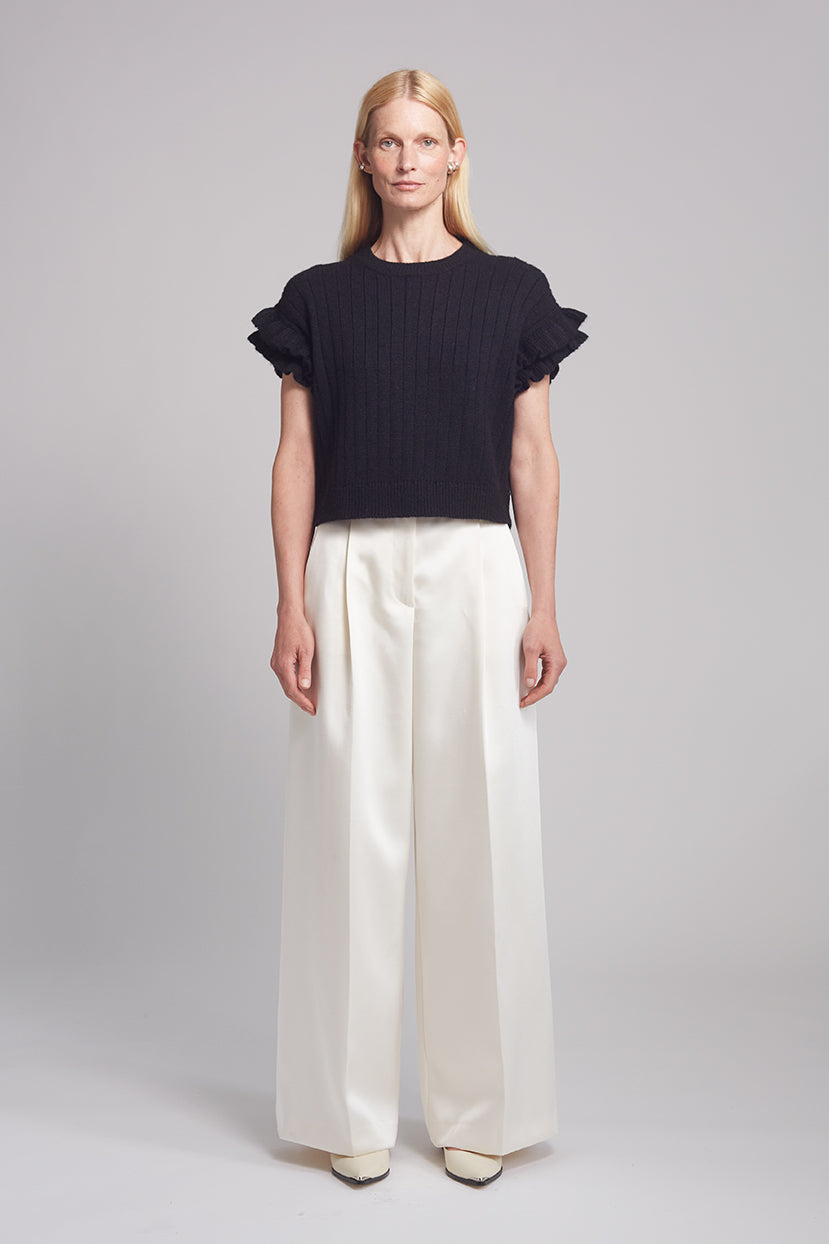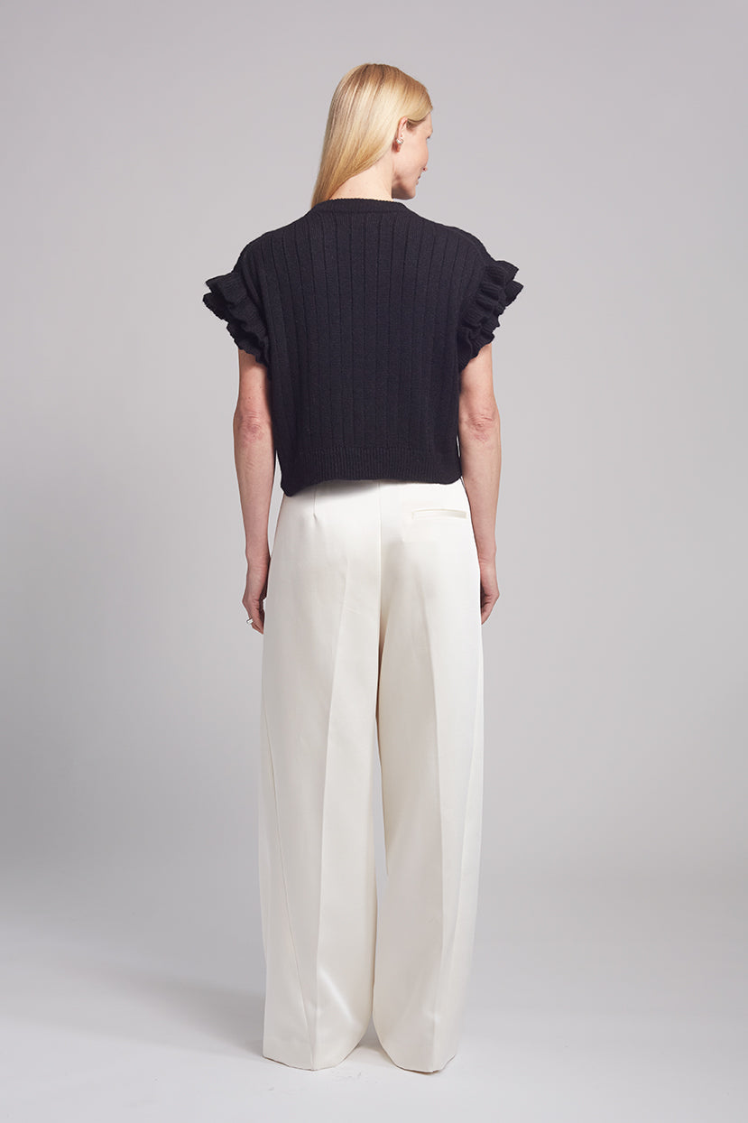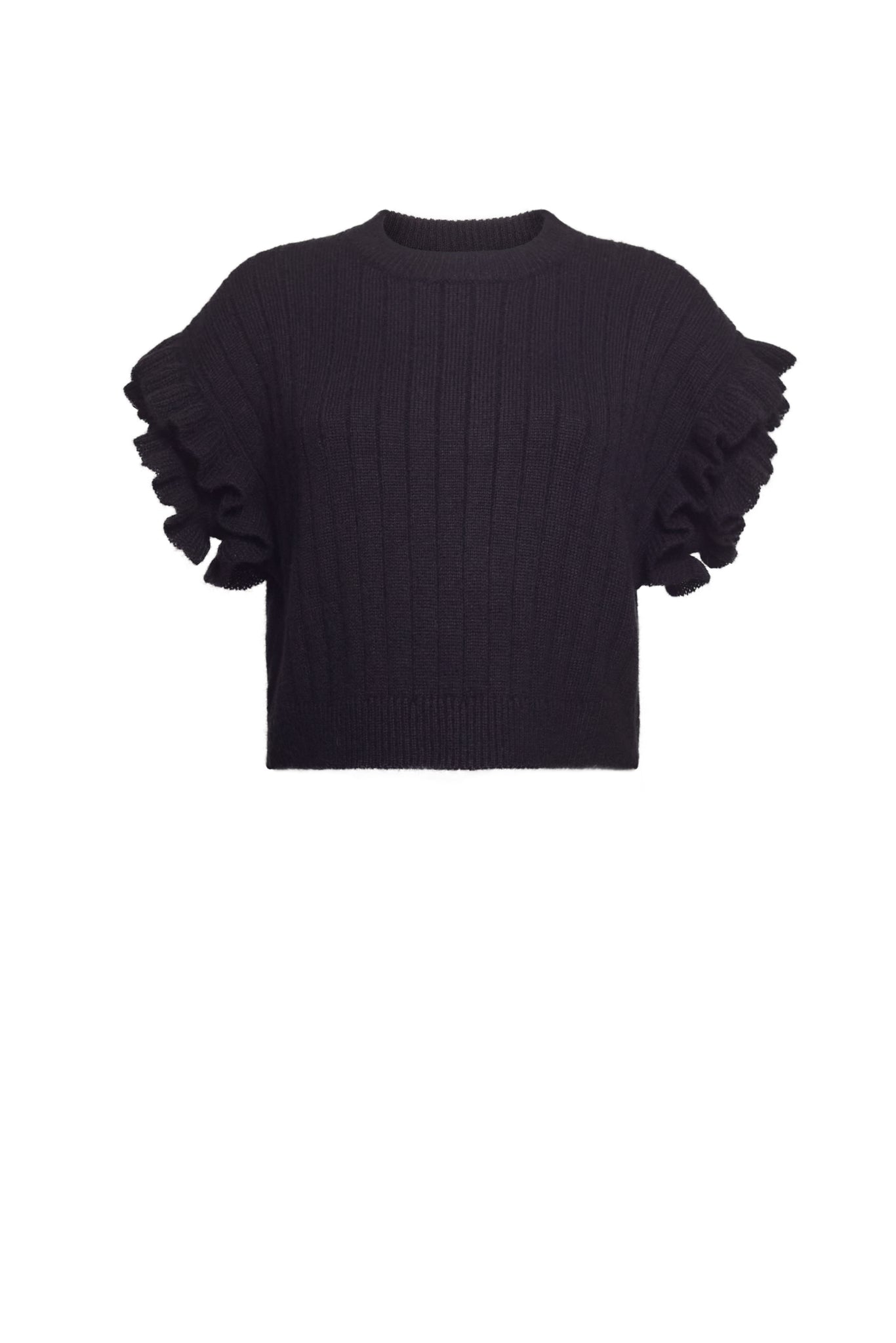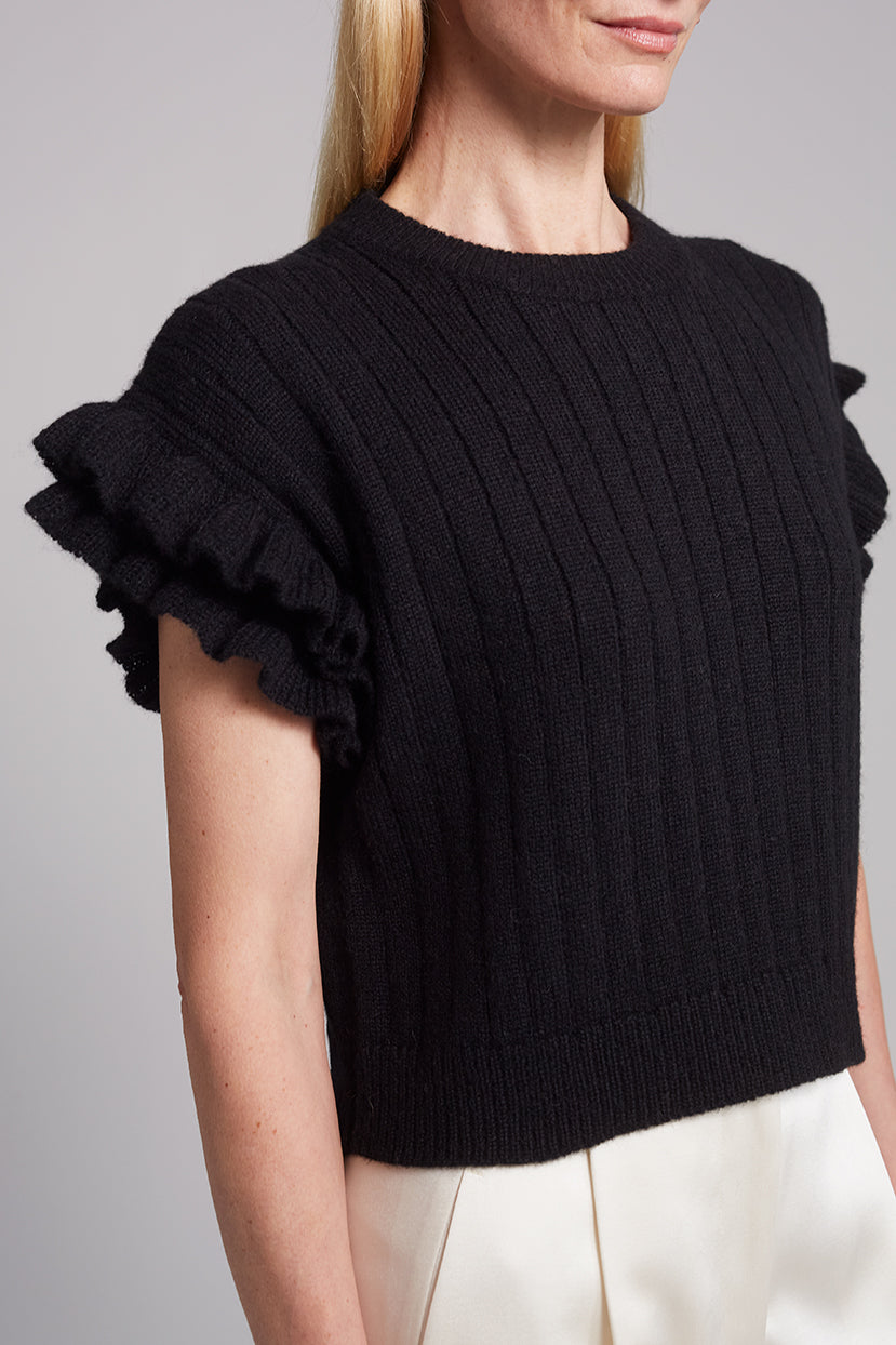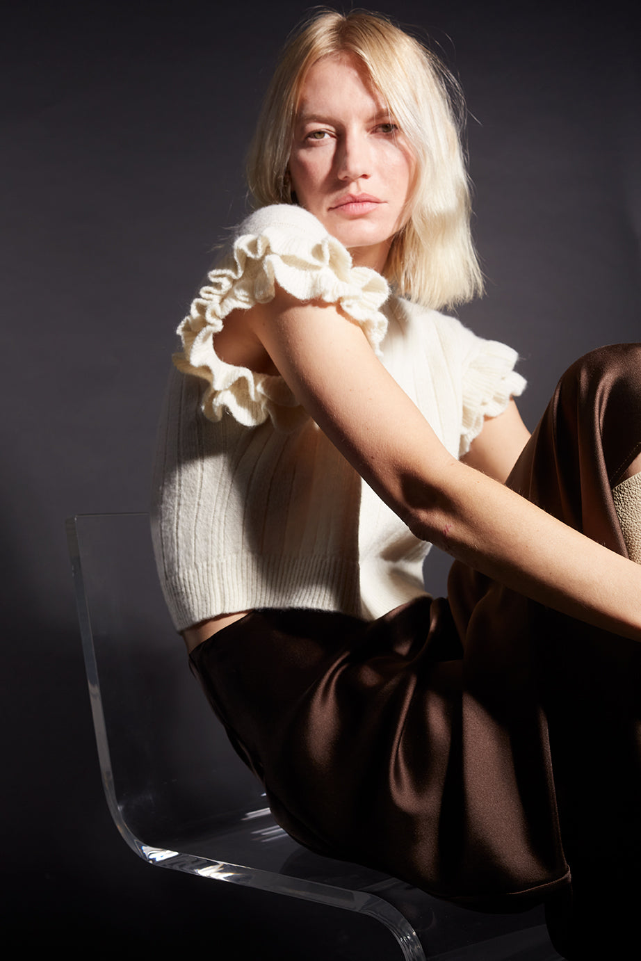 Tanya is a feminine sweater top featuring double ruffled armhole details and a modern wide-rib body stitch. Its slightly cropped silhouette pairs effortlessly with high-waisted pants or silky slip-skirt, creating a chic, dressy look perfect for the holiday season.