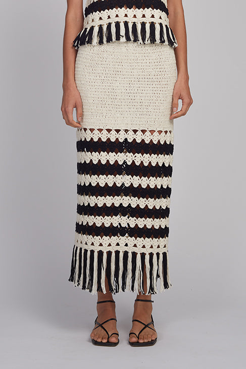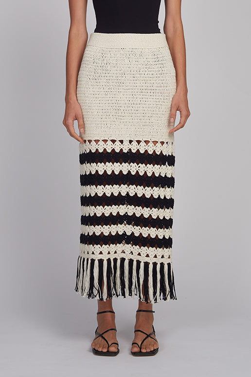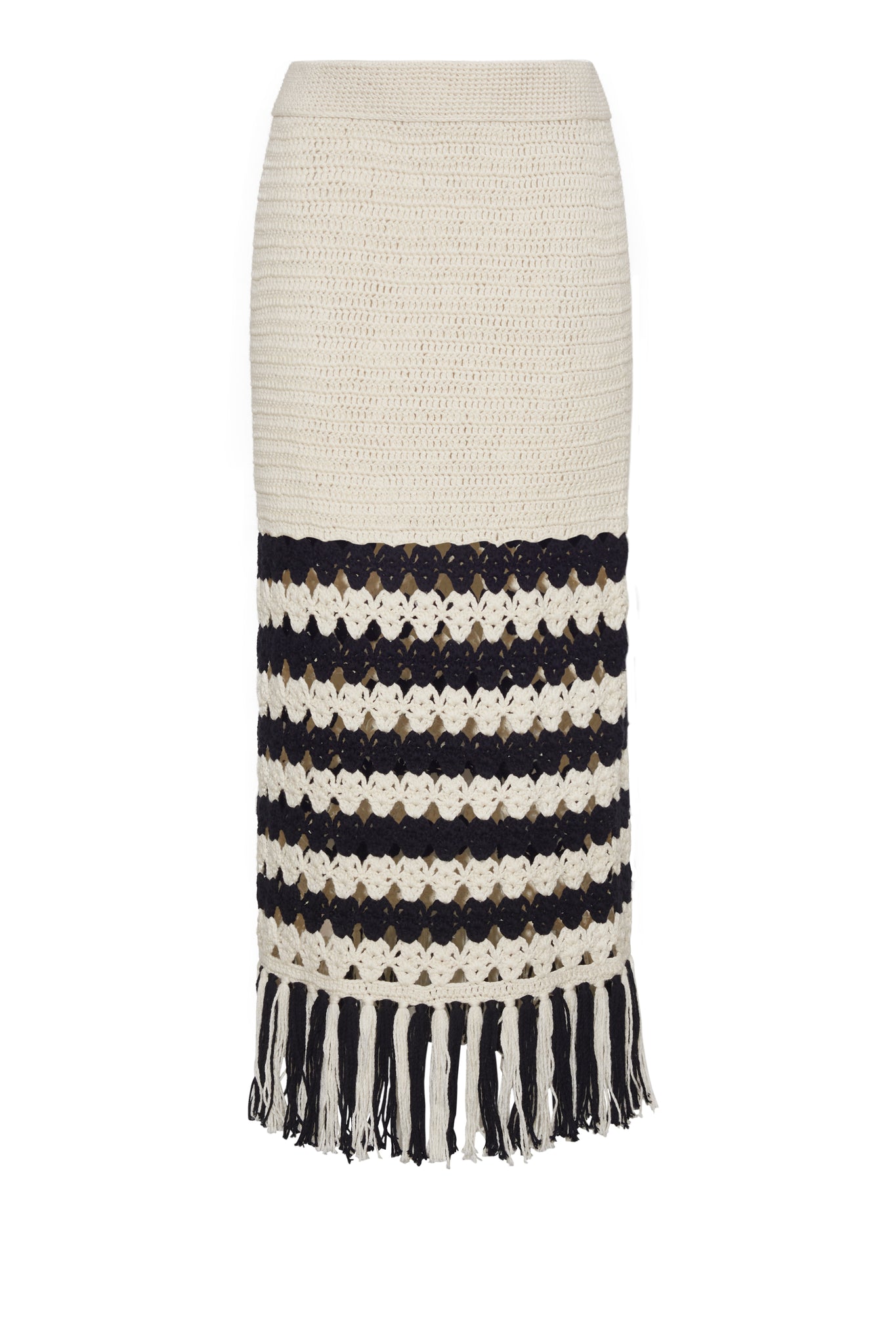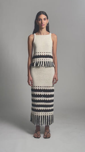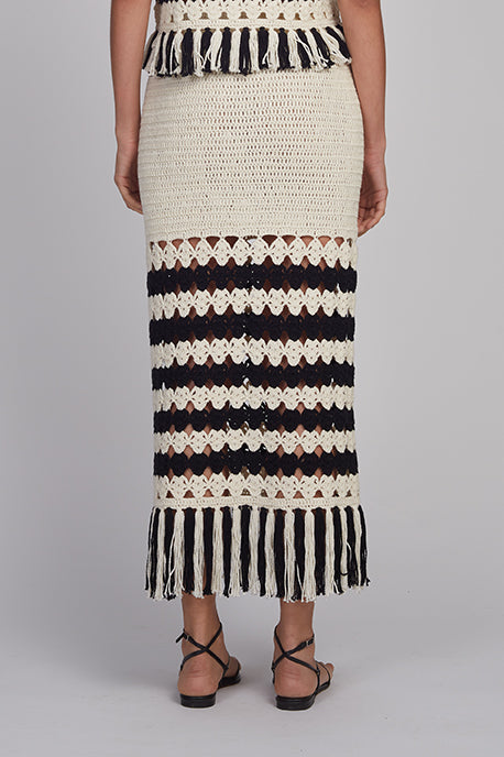 - Two tone striped crochet stitch panel that transitions into a fringed hem.