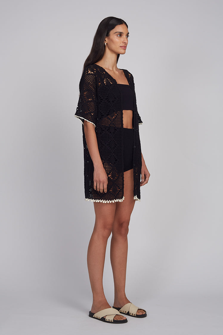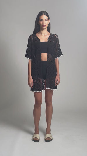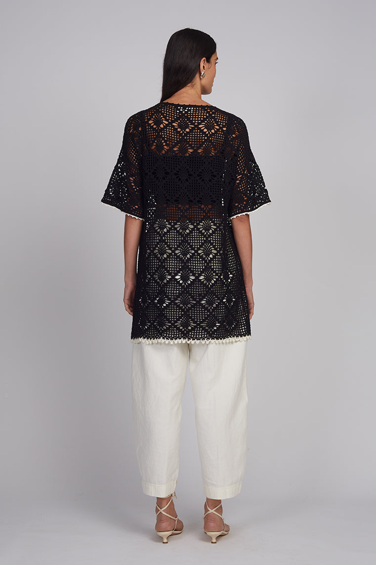 The Violet Crochet Cover-Up is meticulously hand-crocheted in a bold diamond stitch, creating rich texture and artisanal depth. Designed for effortless versatility, it can be worn solo as a tunic over swimwear or layered over denim or tailored trousers for a polished daytime look. Evoking the ease of high summer, this piece exudes a refined vacation sensibility.