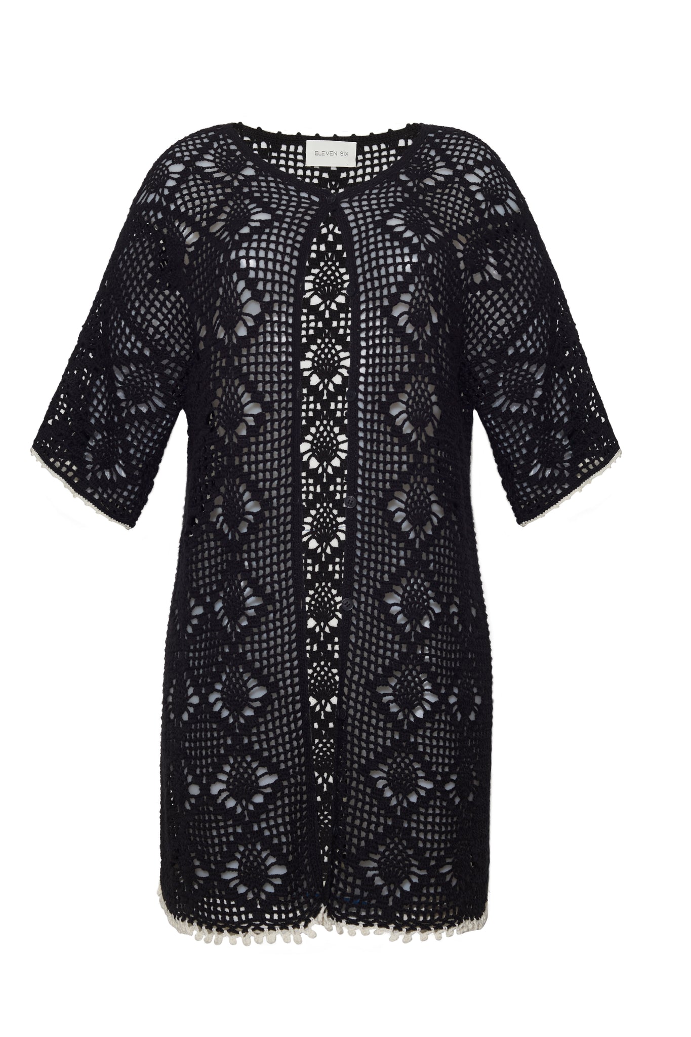 Crew neck with button through detail and contrast black tipped edges at cuff and bottom hem