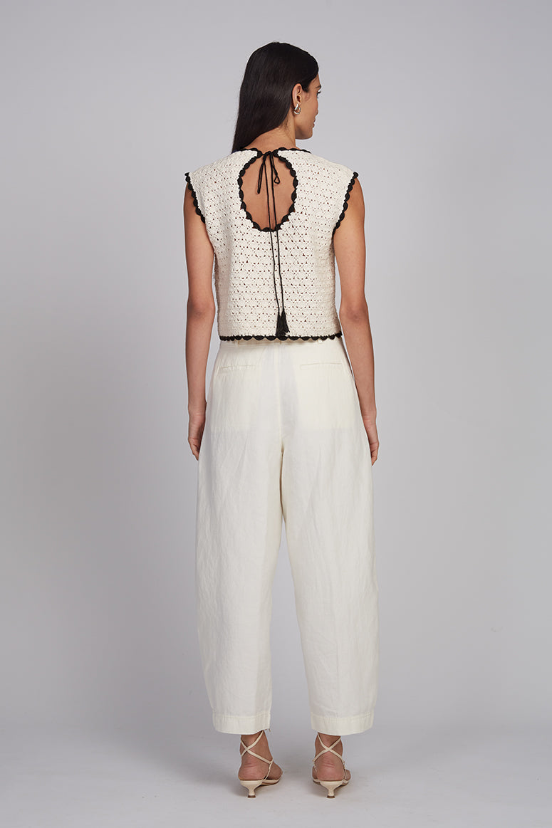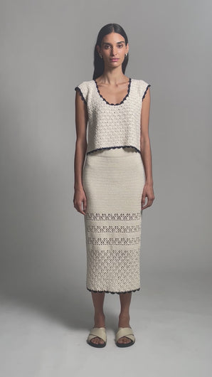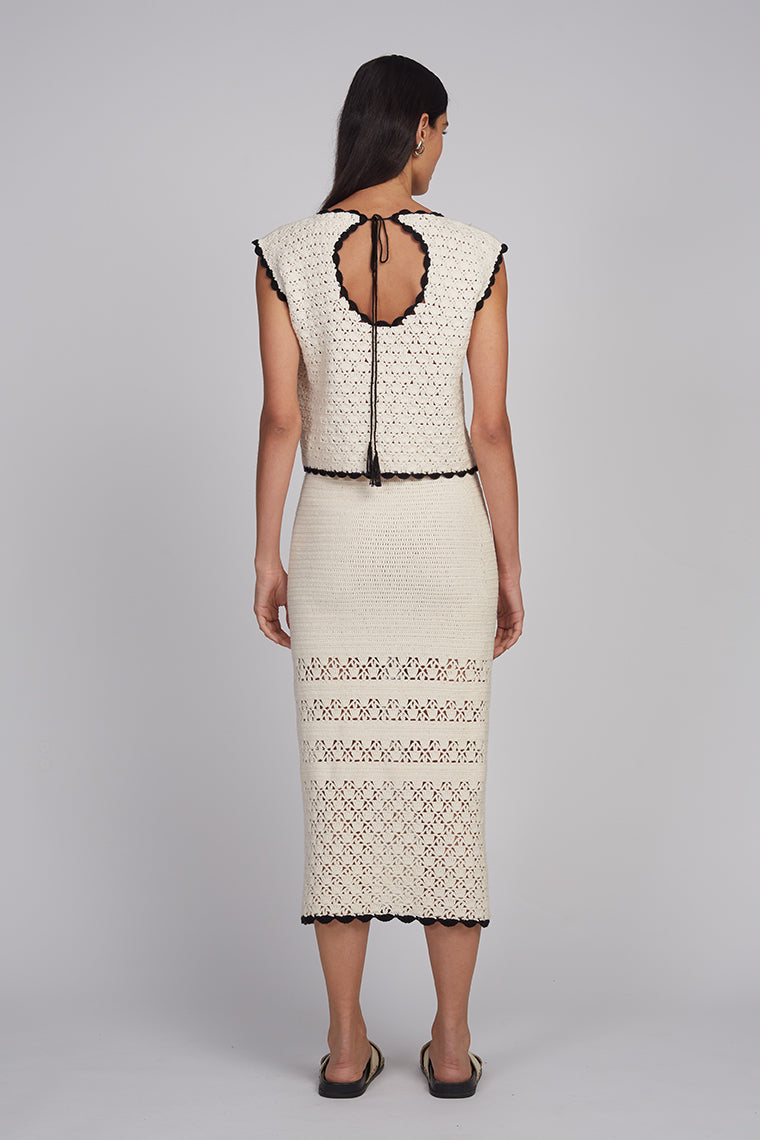 The Zaria Crochet Top is a relaxed shell silhouette, intricately crafted in a modern, graphic open-lace stitch that feels both artful and effortless. Designed with a flattering scoop neckline and a playful back keyhole finished with a tassel-tie detail, it offers subtle allure from every angle. Style it with your favorite high-waisted trousers for an elevated everyday look, or pair it with the matching Lucia Skirt for a striking, head-to-toe knit set.