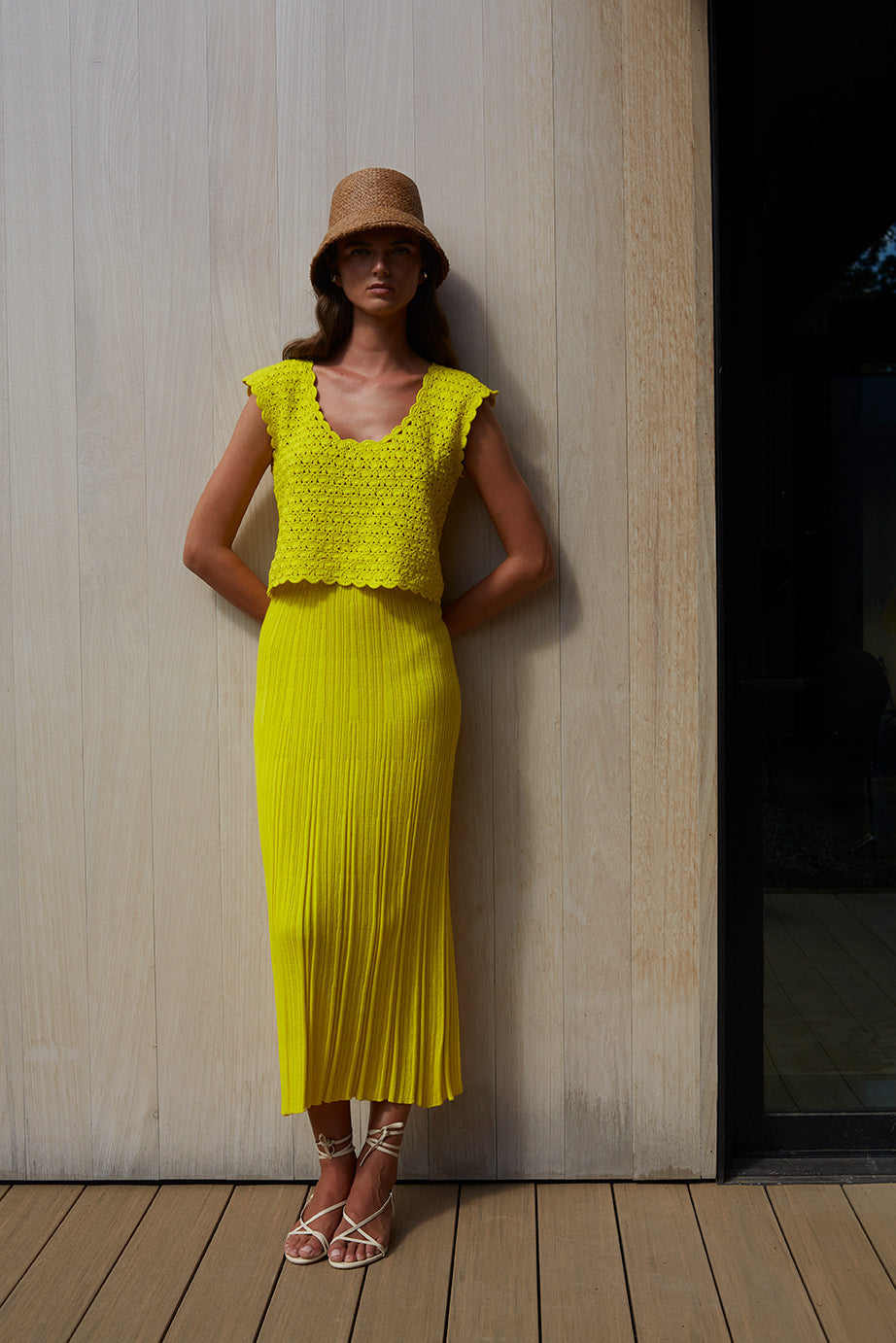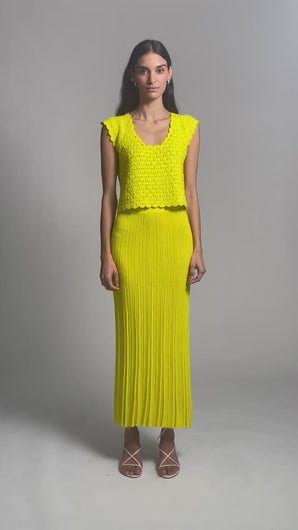 The Zaria Crochet Top is a relaxed shell silhouette, intricately crafted in a modern, graphic open-lace stitch that feels both artful and effortless. Designed with a flattering scoop neckline and a playful back keyhole finished with a tassel-tie detail, it offers subtle allure from every angle. Style it with your favorite high-waisted trousers for an elevated everyday look, or pair it with the matching Sally Skirt for a striking, head-to-toe knit set in this vibrant limone hue.